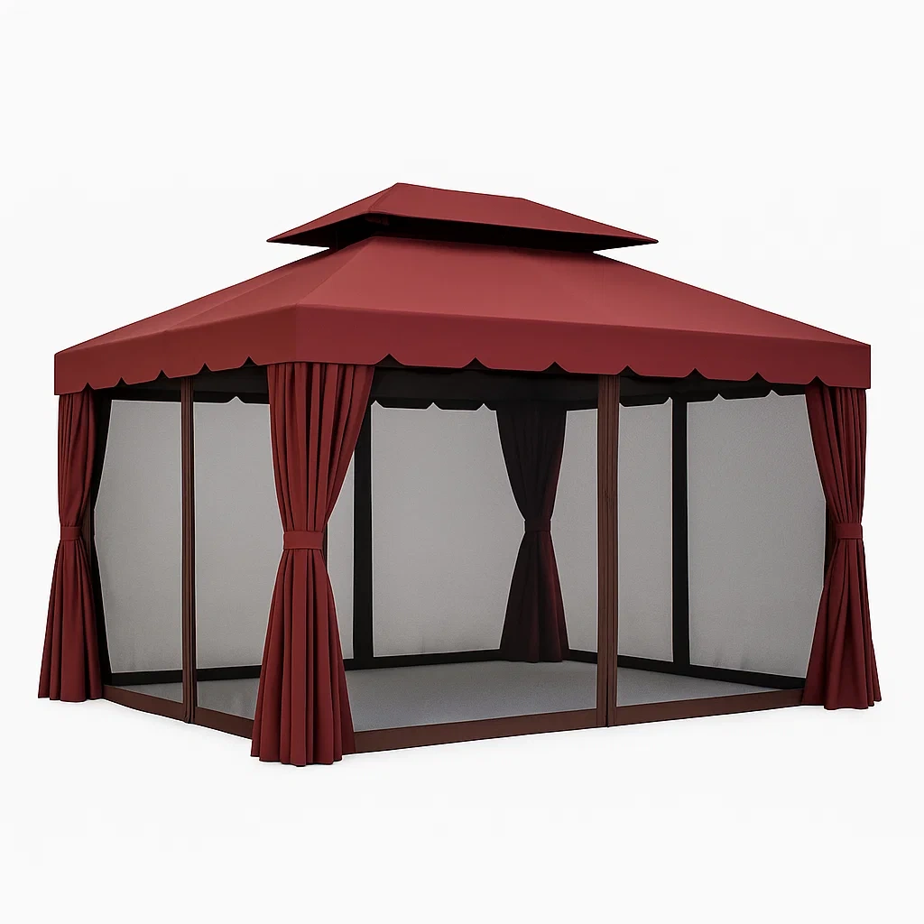 Materiale: Struttura in alluminio, copertura e tende in poliestere, zanzariera in rete sintetica.